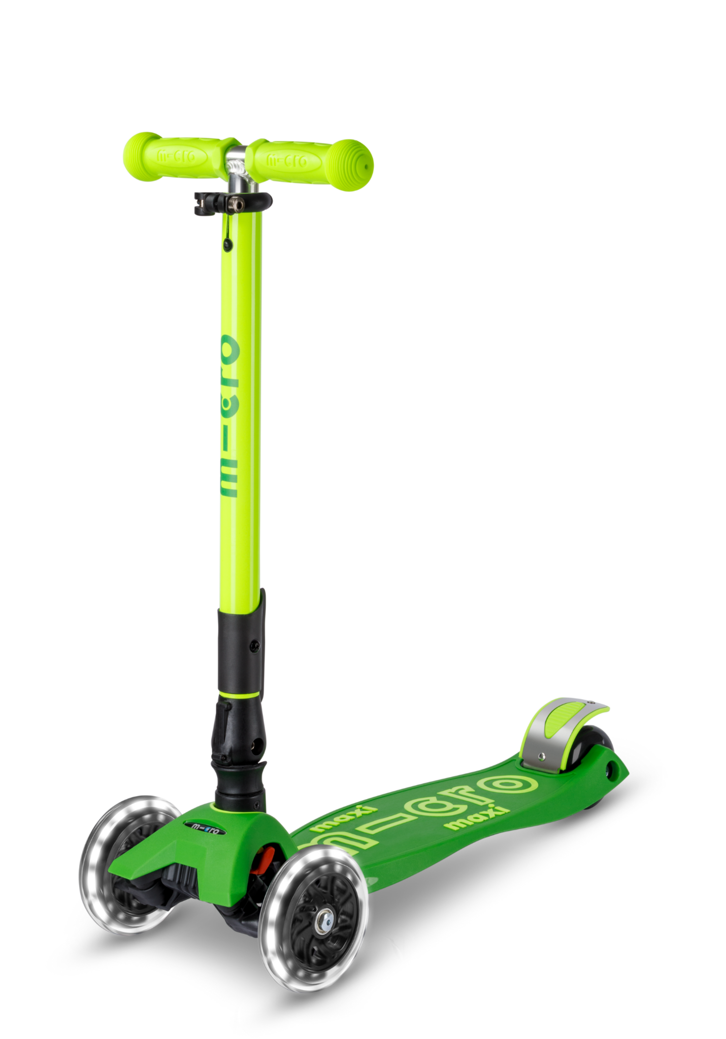 Safety: With the Maxi Micro Deluxe foldable LED scooter, you choose a safe kids' scooter. The adjustable handlebar height ensures a perfect fit for your child's height. The double front wheels and stable fiberglass board provide extra stability. Additionally, the battery-free LED lights in the wheels make the 3-wheel scooter extra visible in the dark. With the lightweight frame, silicone grip letters on the deck, and easy-to-use steel brake, your child easily stays in control.