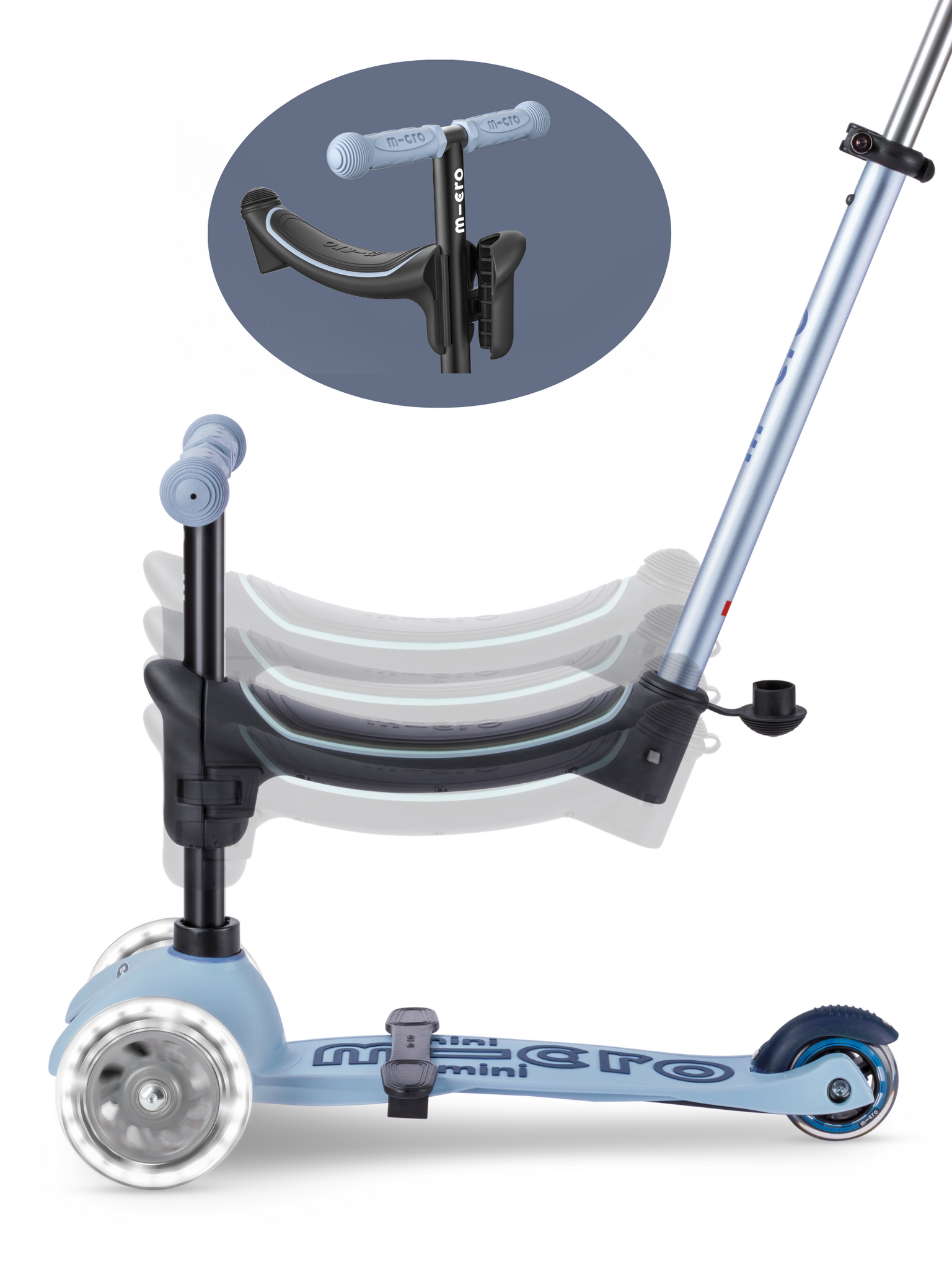 The ergonomic seat can be adjusted to four different heights and adjusted with just two clicks, ensuring a perfect fit for your child as they grow. Once your child is ready to start scooting, simply remove the seat and you have the well-known Mini Micro three-wheel scooter first with a low and later an adjustable handlebar.