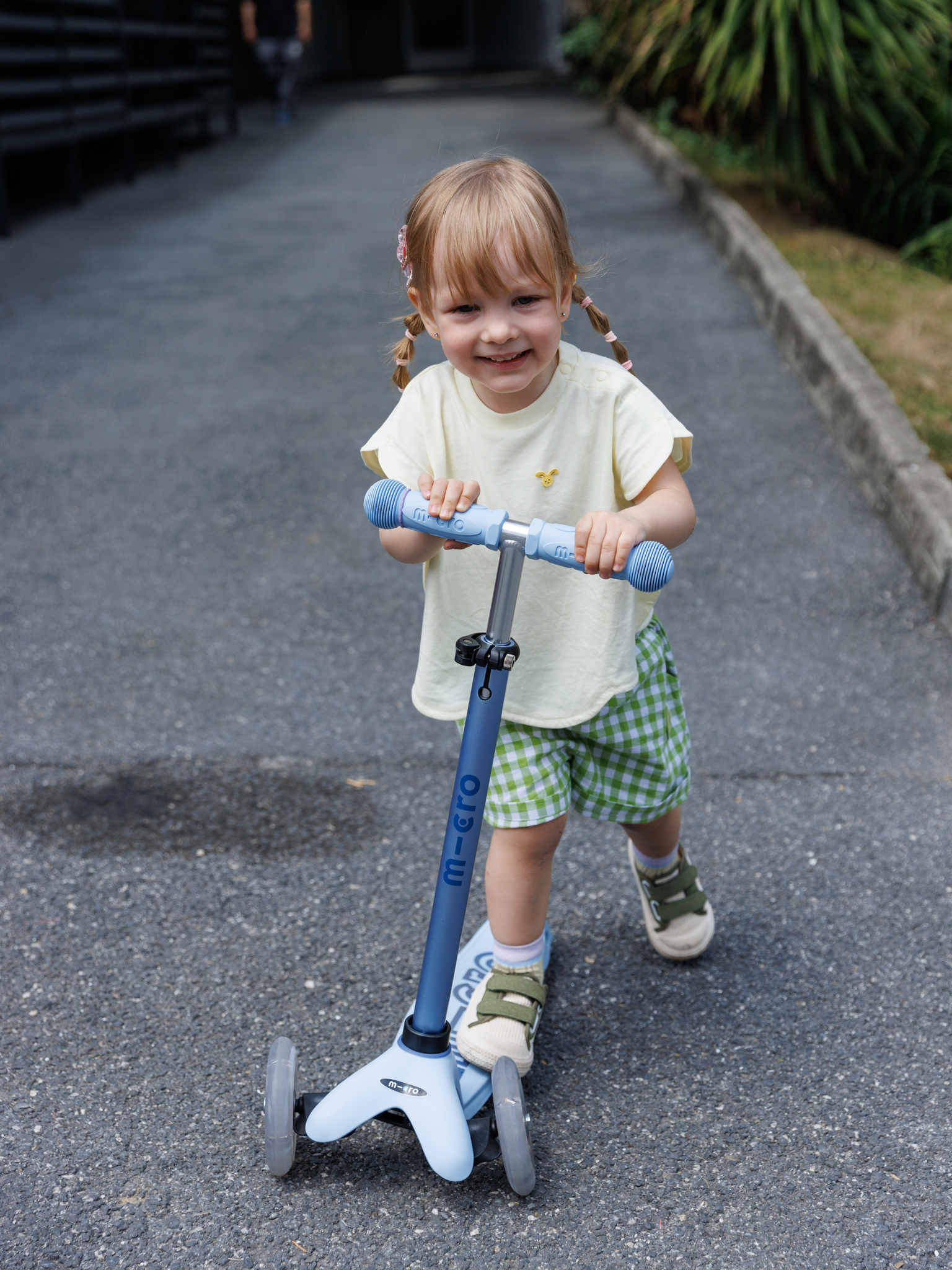 From 2 years: Mini Micro scooter with low fixed handlebar. The seat is removed and makes way for the first real scooter experience. The small T-bar provides a comfortable grip for young children. Thanks to the lean-to-steer system invented by Micro Mobility, the riding style is more intuitive and more fun. This system stimulates the development of motor skills and balance and gives children a sense of independence.