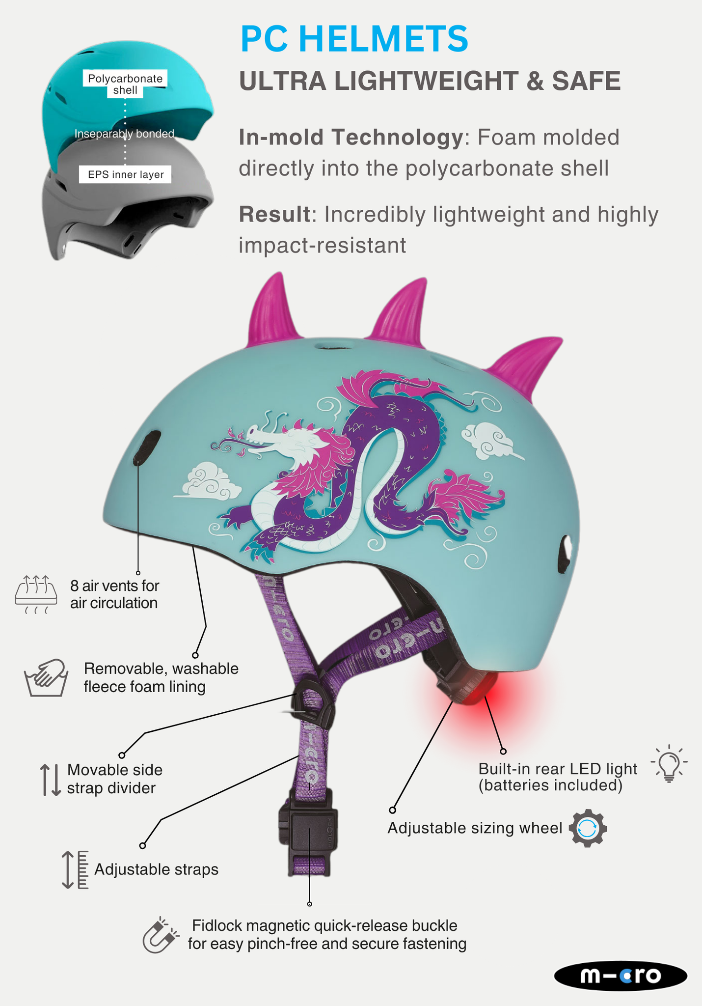 Les casques pour enfants Micro PC Deluxe allient la précision suisse à des caractéristiques de sécurité avancées. Ces casques possèdent une coque extérieure robuste en PC moulée, associée à une mousse intérieure en EPS, ce qui les rend légers tout en offrant une excellente protection. Idéaux pour un usage quotidien, ils assurent confort et sécurité aux enfants. La finition néochrome crée un effet de changement de couleur unique en fonction de la lumière.