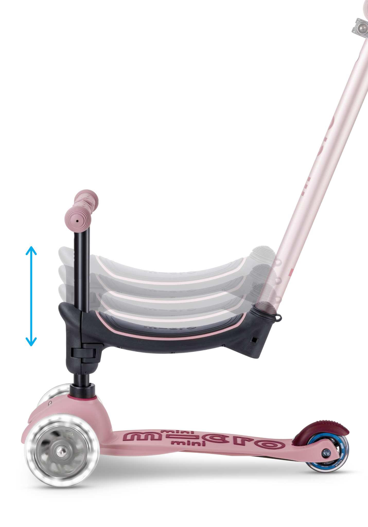 La selle ergonomique est réglable sur quatre hauteurs et se modifie en deux clics seulement, pour s’adapter parfaitement à la taille de votre enfant. Lorsque votre enfant est prêt à trottiner, retirez simplement la selle et vous obtenez la célèbre Mini Micro à trois roues avec guidon bas ou réglable.